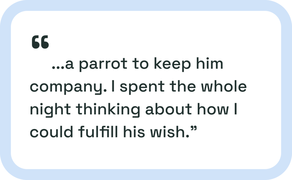 When he was hospitalized and nearing the end of his life—something neither of us knew—a night he asked me to buy him a parrot to keep him company. I spent the whole night thinking about how I could fulfill his wish.
